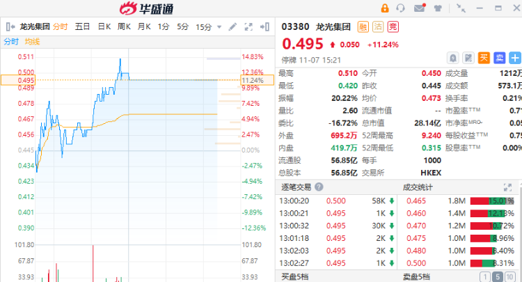 龙光集团(03380)自下午1时02分起短停买卖,停牌前报0.495港元,涨11.24%。停牌原因未披露。