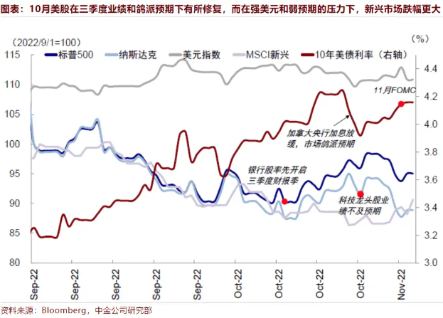 展望11月,尽管情形已经有了一些信号和预期的边际变化(如FOMC会议声明暗示未来加息步伐放缓、10月非农失业率抬升和工资增速放缓表明就业市场出现一些冷却迹象),但我们认为仍要保持一定的耐心等待更为明确的转机。