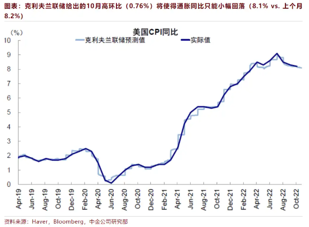 将于11月中公布的10月通胀或大概率继续回落但恐怕也无法寄予厚望。根据目前克利夫兰联储CPI Nowcasting和市场一致预期,10月的高环比(0.76%)将抵消去年同期的高基数使得通胀同比只能小幅回落(8.1% vs. 上个月8.2%),因此不足以彻底扭转市场或者美联储对于通胀的担忧。