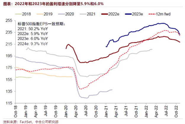 三季度美股业绩好于预期是10月美股在美债利率上行过程中依然能够反弹的主要支撑之一。不过,业绩期期间的盈利下调趋势也同样明显,业绩期期间市场对于2022年和2023年的EPS预期分别下调1%和2.8%、使得2022年和2023年的盈利增速分别降至5.9%和6.0%。