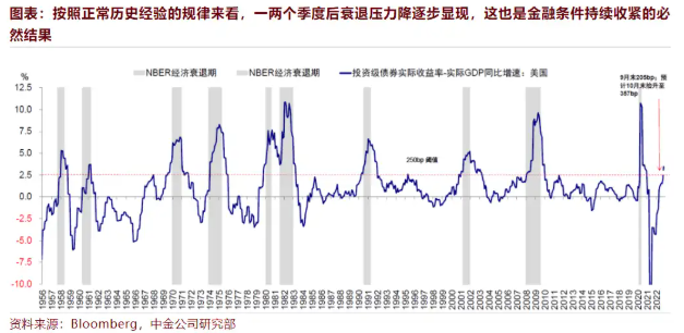 11月FOMC加息后,3m10s利差也一度倒挂,表明短端融资成本已经高于投资回报率,金融条件在各个环节都已经明显进入收紧区域(如房地产、企业融资等)。按照正常历史经验的规律来看,一两个季度后衰退压力将逐步显现,这也是金融条件持续收紧的必然结果。