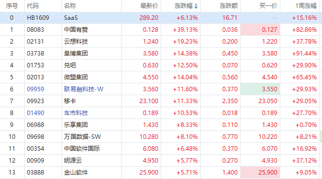 11月7日讯,港股SaaS概念股今日持续走强,中国有赞大涨近40%,2日累计升幅近70%;阜博集团涨超14%,微盟集团涨超14%,联易融科技涨超11%。