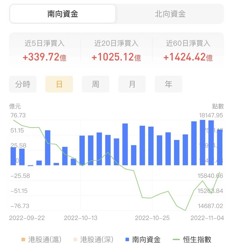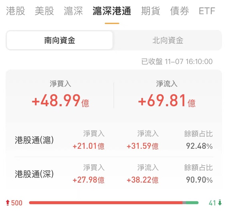 南下资金今日净买入港股48.99亿港元,其中港股通(沪)净买入21.01亿港元,港股通(深)净买入27.98亿港元。上一交易日净买入港股60.47亿港元。