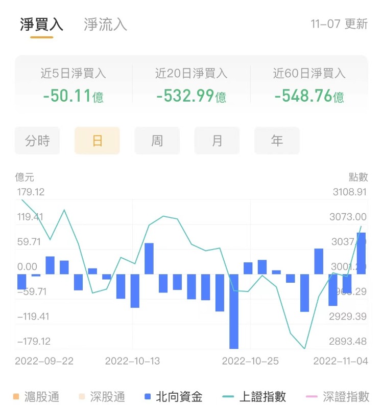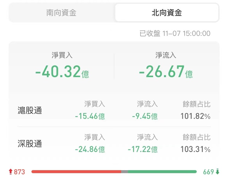 北上资金今日净卖出40.32亿元,沪股通净卖出15.46亿元,深股通净卖出24.86亿元。上一交易日净买入净买入99.93亿元。