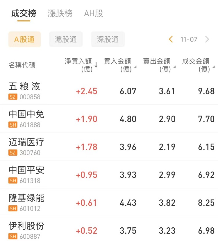 北上资金今日净买入五粮液 $00858.HK 2.45亿元,为今日买入之最;净买入中国中免 $601888.SH 1.9亿元。