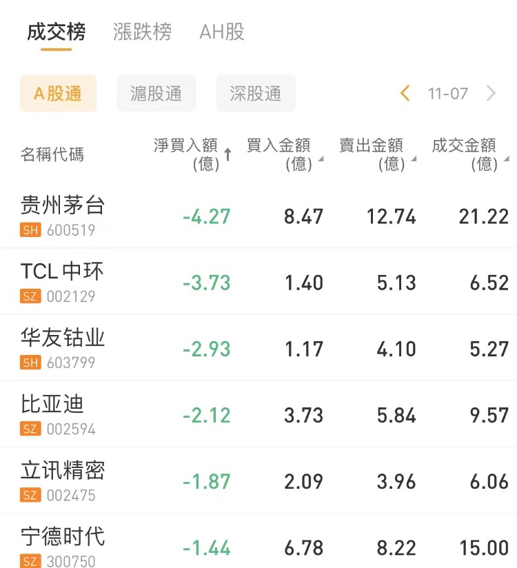 今日北上资金净卖出贵州茅台 $600519.SH 4.27亿元,TCL中环 $002129.SZ 遭净卖出3.73亿元。