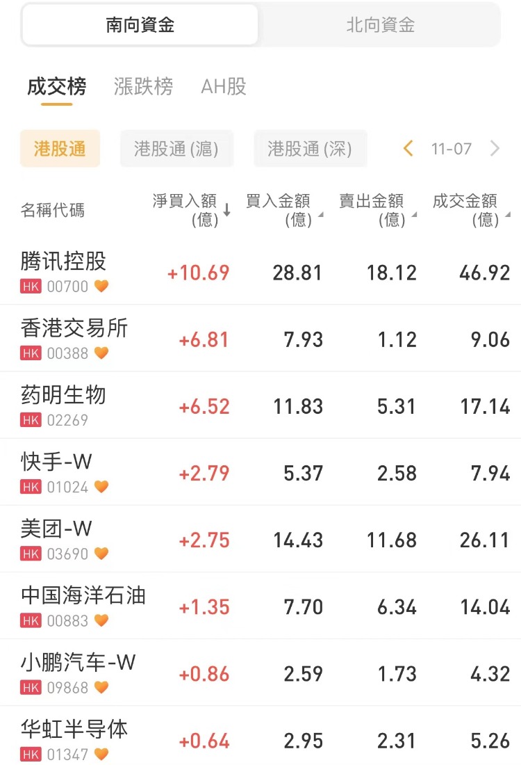 南下资金净买入腾讯控股 $00700.HK 10.69亿港元,净买入香港交易所 $00388.HK 6.81亿港元。此外,净买入药明生物 $02269.HK 6.52亿港元,快手 $01024.HK 获净买入2.79亿港元。