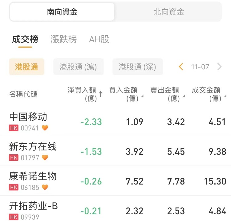 南下资金净卖出中国移动 $00941.HK 2.33亿港元,为今日卖出之最。净卖出新东方在线 $01797.HK 1.53亿港元。
