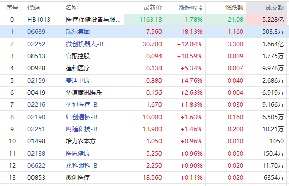 华盛资讯11月8日消息,港股部分医疗器械概念早盘走强,微创机器人-B一度涨超16%,现涨12.04%,报30.7港元每股 。截至发稿,瑞尔集团涨超18%,微创医疗涨0.11%,归创通桥跟涨。
