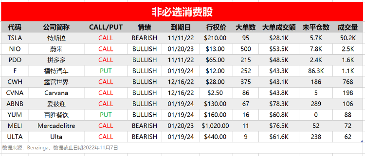 - 蔚来出现2023年1月20日到期、行权价13美元的看涨期权异动大单,成交500张,总成本5.35万美元,显示看多情绪,该期权链近一个月成交量显著上升。周一美股新能源车板块集体下跌,蔚来收跌约6%。