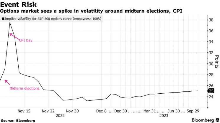 期权市场也出现了类似的担忧,标普500指数合约隐含波动率的一项指标显示,截至周三,该合约的隐含波动率上升了约40%,该合约时间涵盖了中期选举,并结束于最新的通胀数据公布之前。这意味着,交易员愿意支付更高的价格,以对冲这些可能出现的动荡。Brandywine Global投资组合经理John McClain表示: