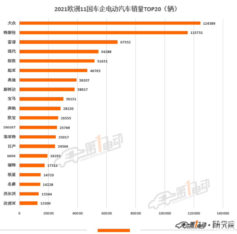 在欧洲的11个国家中,2021年特斯拉的销量为11.57万辆,仅次于欧洲本土品牌大众,排名第二;而中国没有任何一家电动车企在欧洲的销量挤进前十。