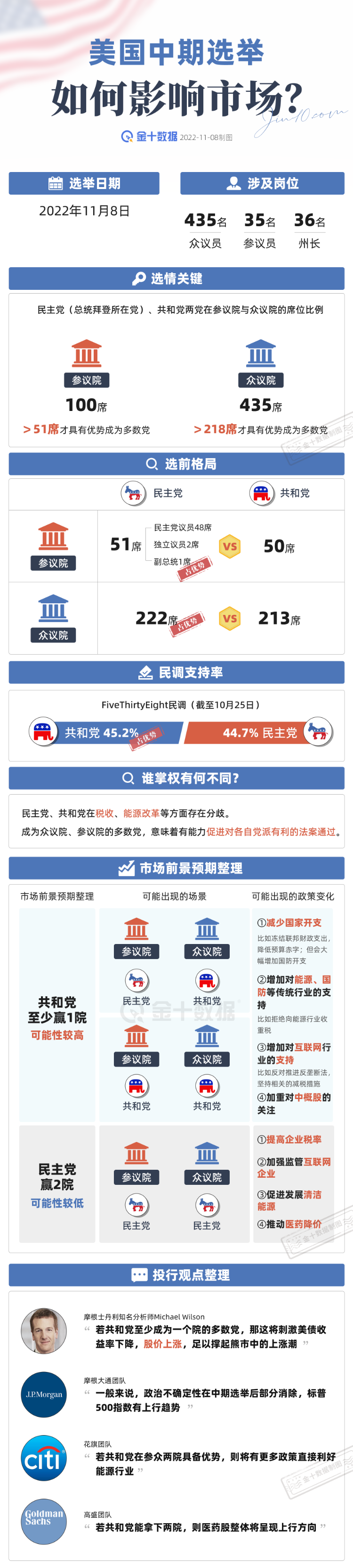 11月8日美国中期选举结果即将出炉。民主党、共和党谁能在参议院、众议院中获得多数席位,关乎着未来两三年内美国在能源、税收、科技等多方面的政策走向。面对这些潜在变化,市场是如何理解,又将如何应对?