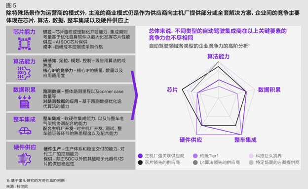 模式众多,都是主机厂和自动驾驶三方供应商基于自身能力和行业判断做出的现实选择。自动驾驶领域的关键竞争要素主要体现在芯片能力、算法能力、数据积累、整车集成、硬件供应五大方面,不同类型的参与者,在五大方面的禀赋优势也有所差异。