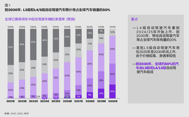 行业普遍预估,到2030年,L2+级别将扩展到90%以上车辆,其中L3级别以上占到50%市场份额。至于更高级别的自动驾驶,L4级别车型预计将于2024年-2025年正式上市,而首批L5级别自动驾驶汽车也将于2025年-2030年间上市。