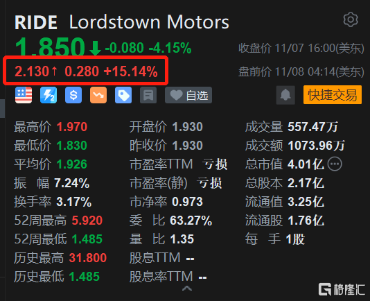 格隆汇11月8日丨电动汽车生产商Lordstown盘前涨15.14%,报2.13美元。该公司已经与富士康旗下Foxconn Ventures达成交易,后者将向这家电动汽车制造商投资高达1.7亿美元,此举将让富士康成为其最大股东。