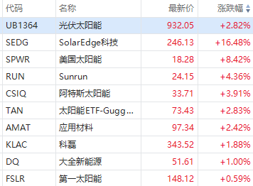 光伏板块盘中大涨,SolarEdge涨超16%,美国太阳能涨超8%,Sunrun涨超4%,应用材料涨超2%。此前SolarEdge Technologies和SunPower这两家公司公布的第三季度销售业绩好于预期。