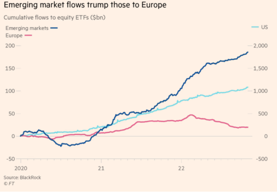 今年迄今流入Emea地区上市的新兴市场股票基金的资金为117亿美元,有望超过2021年的123亿美元,这与追踪欧洲股市的ETF相去甚远,后者今年迄今已出现150亿美元的净流出。