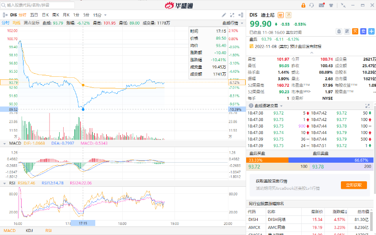 财报公布后,盘后迪士尼股价跳水,一度跌超10%;现报93.79美元美股,跌6.12%。