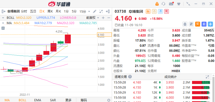 近日,SaaS板块迎来持续反弹。10月31日至11月9日收盘,阜博集团 $03738.HK 8个交易日股价累计反弹超123%,微盟集团 $02013.HK 累涨逾62%,移卡 $09923.HK 累涨近18%,金蝶国际 $00268.HK 反弹逾15%。新股多想云 $06696.HK 今日首挂一度涨逾65%,昨日暗盘收涨42.86%。