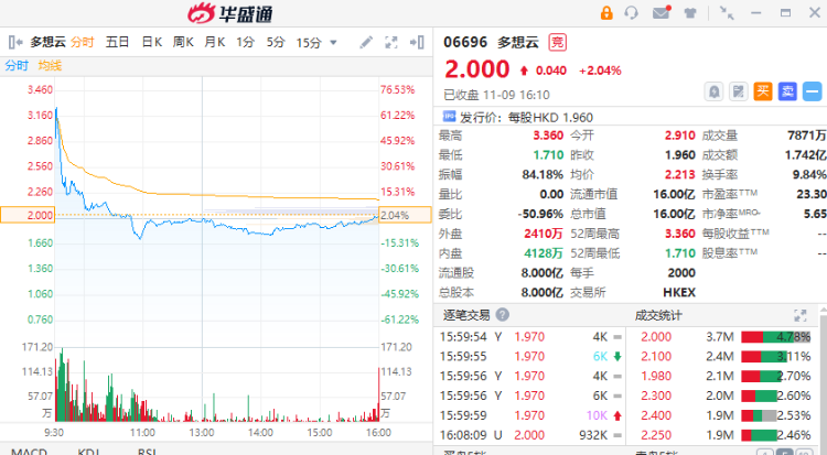 华盛资讯11月09日讯,营销服务商多想云 $06696.HK 早盘一度涨超66%,股价盘中跳水全日仅收涨2.04%,成交额1.742亿港元,最新总市值16亿港元。