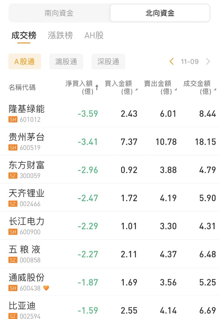 今日北上资金净卖出隆基绿能 $601012.SH 3.59亿元,贵州茅台 $600519.SH 遭净卖出3.41亿元。