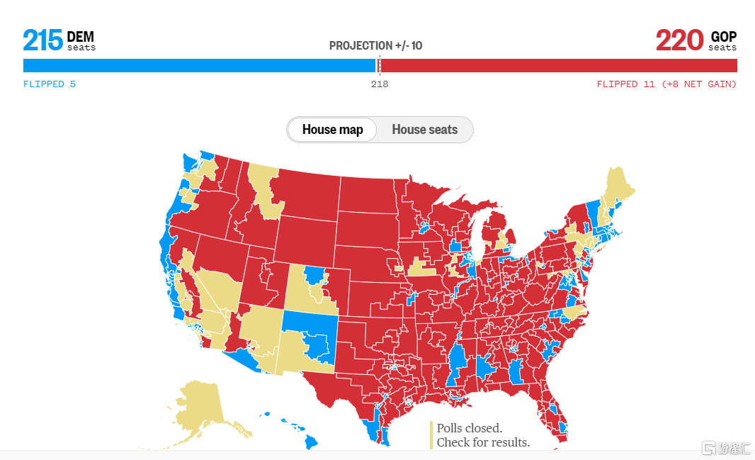 NBC 估计,共和党人最终可能会在众议院获得 220 个席位,或以微弱的优势取得众议院的控制权。