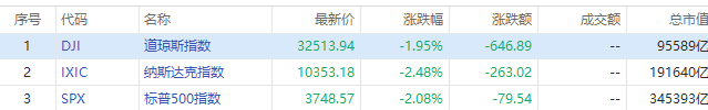 道琼斯工业指数跌646.89点,至32,513.94点,跌幅约1.95%。迪士尼领跌,该娱乐巨头的营收和利润均低于分析师预期,下跌了13.2%。标准普尔500指数下跌2.08%,至3,488.57点,纳斯达克综合指数下跌2.48%,至10,353.17点。