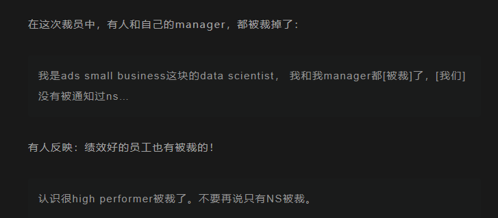 ,自己(数据科学家)和直接汇报的经理都被裁了,之前的绩效考核当中并没有拿到较差的等级。