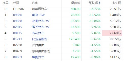 11月10日讯,原本四季度将迎来传统消费旺季,没想到却等来了“寒冬”。港股汽车股今日午后跌势持续扩大,截至发稿,蔚来-SW续跌超12%,小鹏汽车-W跌超10%,理想汽车-W、吉利汽车跌超7%,比亚迪股份跌5.67%。