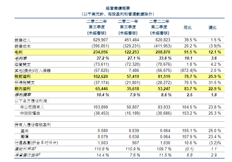 - 具体来看,销售成本3.959亿美元,同比上升20.2%,主要由于晶圆销售量上升及折旧成本上升,环比下降3.9%,主要由于晶圆销售量下降。