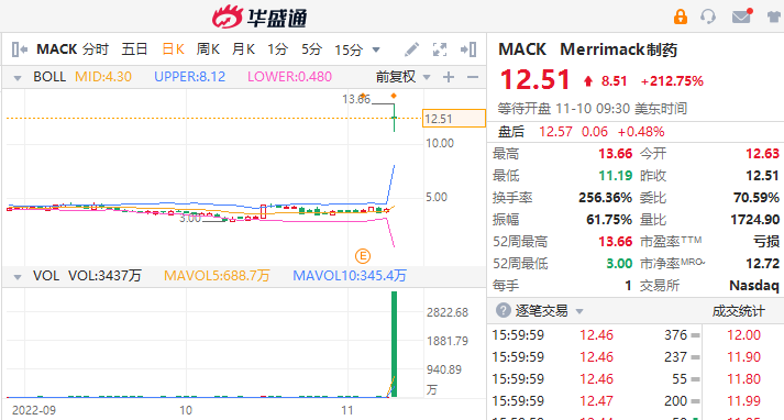 周三美股市场上,生物制药概念股Merrimack制药 $MACK 暴涨212.75%,该公司法国癌症治疗合作伙伴Ipsen S.A.宣布,其药物Onivyde作为一种组合疗法,在一种胰腺癌的后期试验中达到了主要终点。