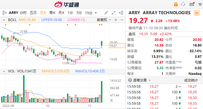 Array Technologies $ARRY 周三收涨13.49%,成交额达到2.61亿美元。该公司创立于1989年,是全球最大的太阳能项目地面安装系统制造商之一。其最新Q3业绩显示,公司在该报告期内收入5.15亿美元,实现同比增长170%;每股盈利约0.18美元,超出市场预期8美分。