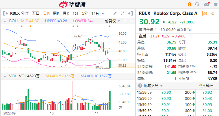 在该报告期内,Roblox的收入远低于去年三季度的水平,营收达5.177亿美元,同比增长2%,分析师预期为6.863亿美元;归母净亏损为2.978亿美元,上年同期净亏损7400万美元;EPS为亏损0.5美元,大幅超过分析师预期的亏损0.35美元。