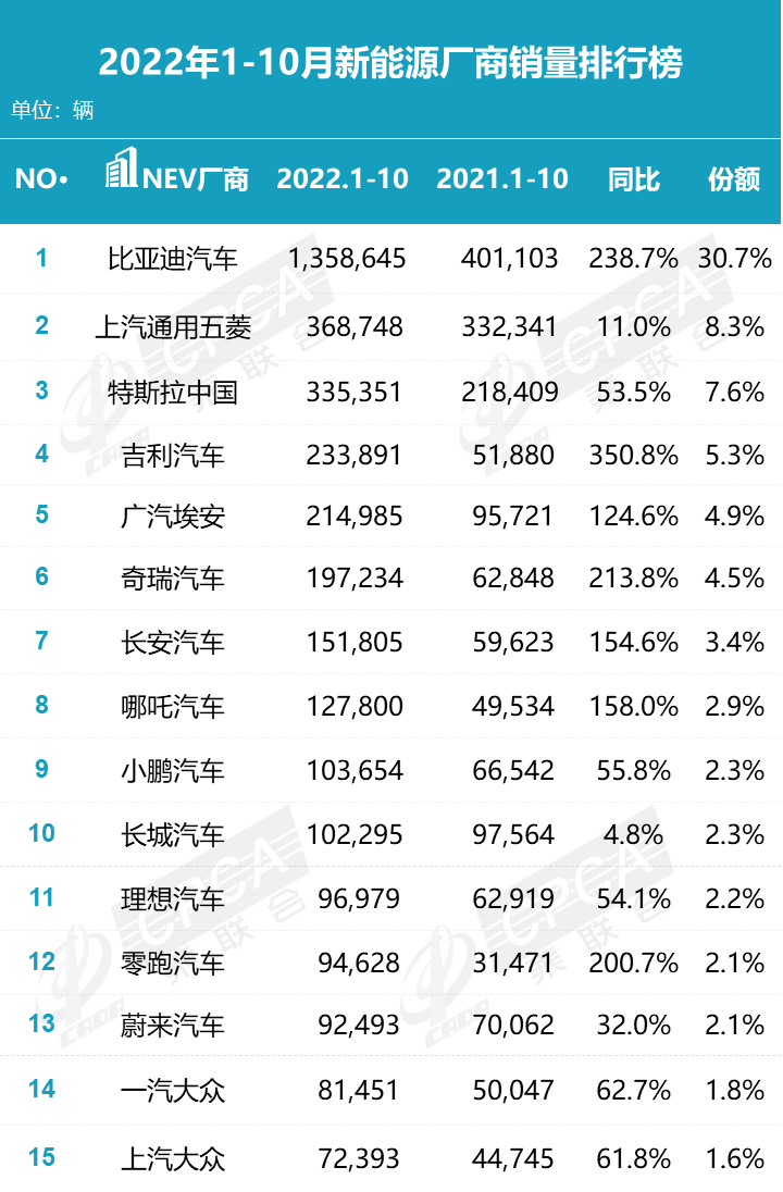 据乘联会发布的2022年1-10月新能源厂商销量排行显示,比亚迪销量“碾压”一众车企。将排名前列的造车新势力,理想、蔚来、小鹏、哪吒、零跑等加在一起的销量,都难以超越比亚迪的成绩。
