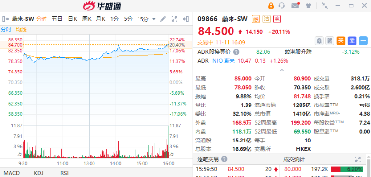 11月11日,汽车板块大幅反弹,蔚来 $09866.HK 绩后涨逾20%领涨汽车股,小鹏汽车 $09868.HK 涨16%,理想汽车 $02015.HK 涨近12%,比亚迪 $01211.HK 股份涨近9%。