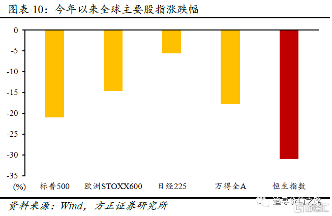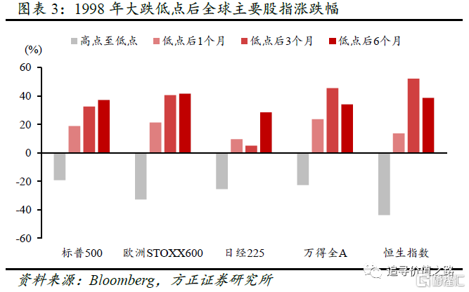 1998年的下跌中全球主要股指走势出现了一定的分化。欧美市场在7月下旬开始下跌,10月初止跌,标普500下跌幅度近20%,欧洲STOXX600指数下跌了33%。亚洲市场指数开始下跌的时间更早,日股和港股开始于3月、A股开始于6月,都于8月到达低点。跌幅方面,标普500指数下跌19%,欧洲STOXX600指数下跌33%,日经225指数下跌25%,万得全A下跌23%,恒生指数跌幅仍高于其他主要股指,高达44%。这一次下跌后反转的行情中港股同样表现出了较高的弹性,低点后三个月和六个月的涨幅分别为52%和39%,仍然为主要股指中最高。