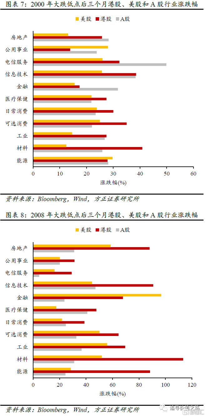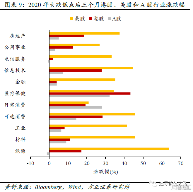 2、历次行情反转中A股、港股和美股不同行业涨幅对比
