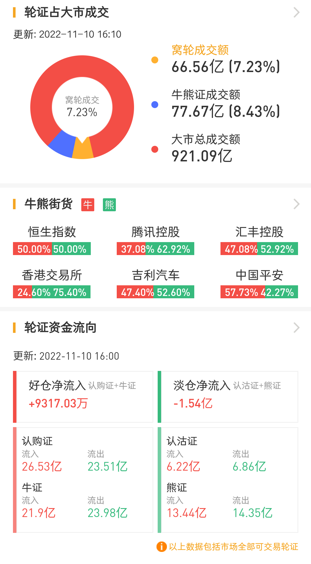其中,窝轮总成交额为66.56亿港元,牛熊证总成交额为77.67亿港元。