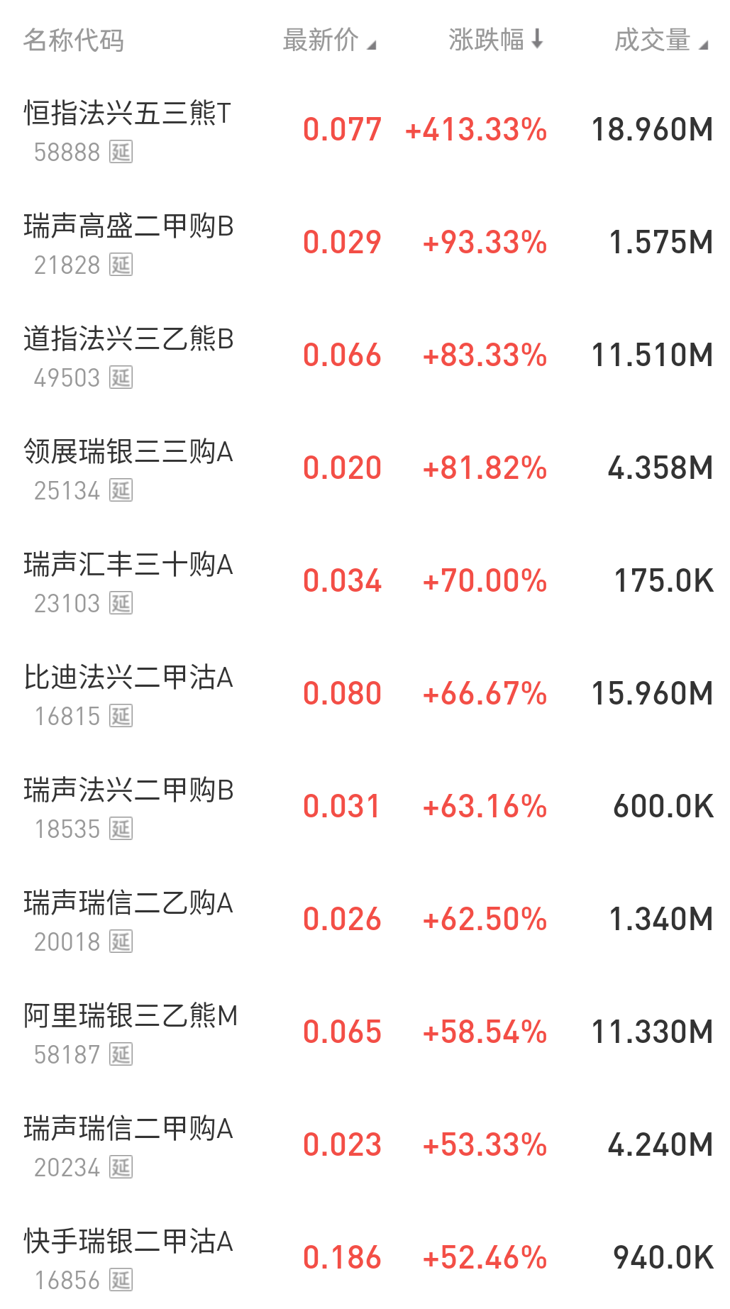 在今日涨幅榜中,瑞声高盛二甲购B $21828.HK 涨93.33%,道指法兴三乙熊B $49503.HK 涨83.33%,此外,领展瑞银三三购A $25134.HK 涨81.82%。
