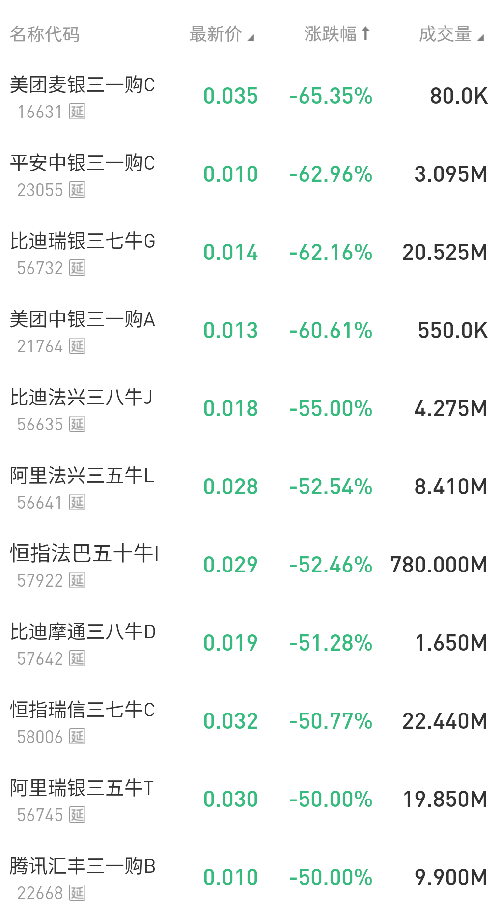 在今日跌幅榜中,美团麦银三一购C $16631.HK 跌65.35%;平安中银三一购C $23055.HK 跌62.96%。