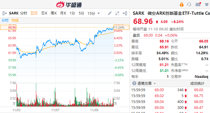 4、 木头姐反买,别墅靠大海!反向做空 $ARKK 的ETF $SARK 推出一周年迄今累涨129%,实现翻倍