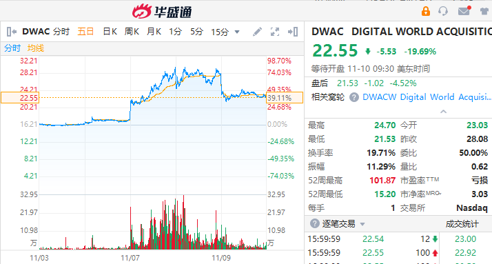 SPAC公司Digital World Acquisition Corp(数字世界并购公司)因与特朗普创立的特朗普媒体和科技集团(Trump Media and Technology Group ,TMTG)的合并上市计划,股价走势基本与特朗普方的动作和双方合并进展“绑定”。双方的合并计划迄今已经持续有一年的时间,仍然未完成。在本月初,DWAC公司首席执行官奥兰多将股东大会延期至11月22日 ,届时将投票决定公司与特朗普旗下社交软件的合并事宜。