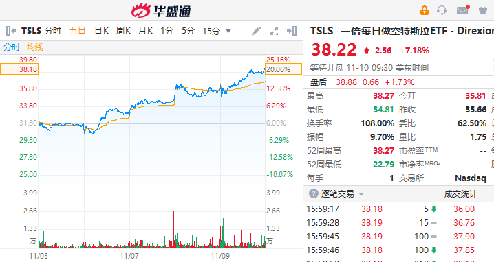 特斯拉股价大跌同时,每日做空特斯拉ETF-Direxion $TSLS 本周累涨15.71%,该ETF自8月发行以来,累计涨幅已达53%。 TSLS是由Direxion发行、反向跟踪特斯拉股价表现的单股ETF。(单股ETF戳这里了解更多 )