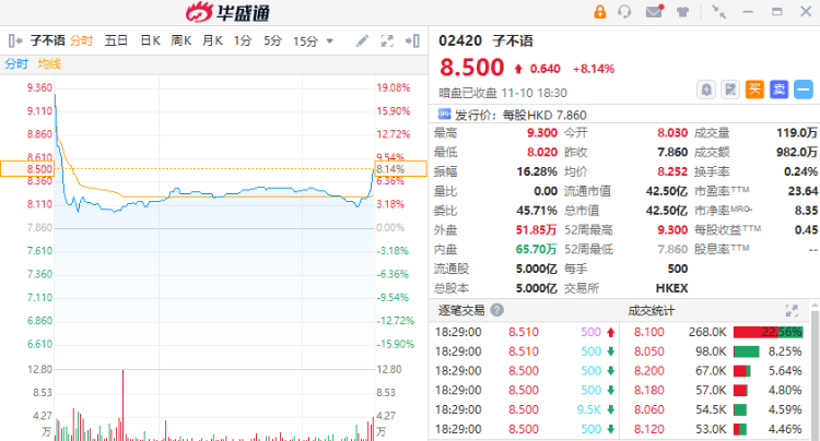 华盛资讯11月10日讯,跨境电商平台子不语 $02420.HK 暗盘盘中一度飙涨18%,尾盘收涨8.40%,不计手续费一手账面浮盈320港元,最新总市值超41亿港元。该股预计将于明日(11.11)正式港股挂牌上市。