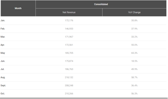 台积电公布,10月营收为2102.66亿元新台币,环比增长1%,同比增长56.3%。为历年同期新高,以及单月历史次高,连续三个月营收在2000亿新台币以上。台积电先前单月营收新高是今年8月约2181亿新台币。台积电累计2022年1至10月营收约为新台币1.85万亿新台币,较去年同期增加44%。