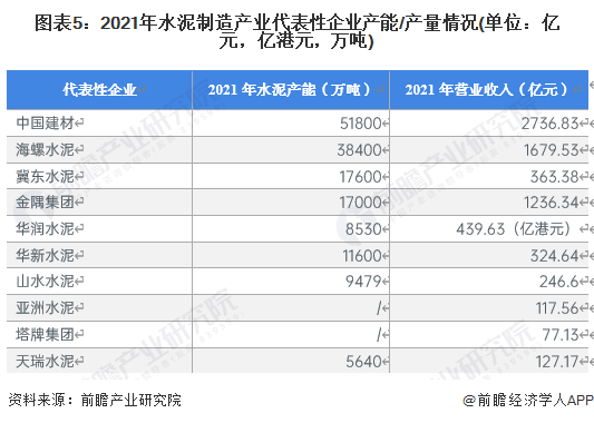 目前,布局了水泥生产业务的上市企业中,中国建材在水泥产品产能与营收遥遥领先于其它企业。水泥制造产业链上的其它代表性企业产能/产量情况如下: