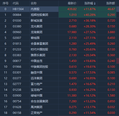 今日港股内房股再度走高,旭辉控股集团涨超40%,新城发展涨超32%,龙湖集团、碧桂园均涨超26%,合景泰富集团涨23.5%。