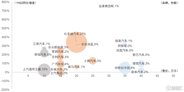 图表14.11:1H22分价格段各品牌核心电动车型销量及同比增速