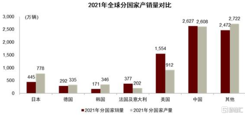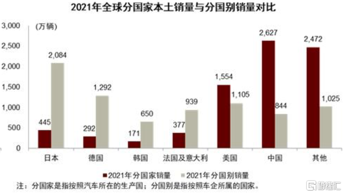 纵观全球汽车产业链格局,中国汽车过去受益全球化浪潮,深度参与其中,实现了领先的销量规模,但并未获得领先技术。2021年中国汽车销量2627万辆,全球份额占比高达33%,但是,中国仍是汽车大国,而非汽车强国。在全球汽车价值链中,日、德、美占领先主导地位,主要因为日、德、美品牌在全球的竞争力强、海外的市场产量规模大,从而形成大部分海外当地生产、小部分本国生产海外出口的全球化布局[1]。